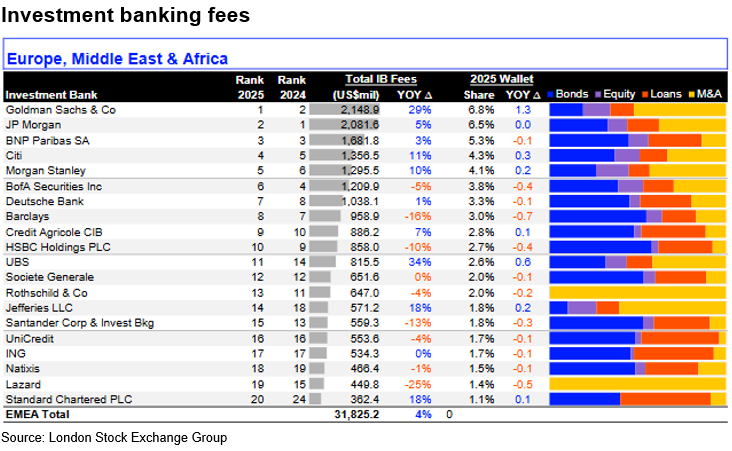 It’s not just about the reflected glory of league-table position. It’s also about how that rolls up into wallet. EMEA investment banking fees increased by 4% in 2025, LSEG data show. But Goldman Sachs increased its fee-take by 29%, Jefferies by 18%, Citigroup by 11%, and Morgan Stanley by 10%.